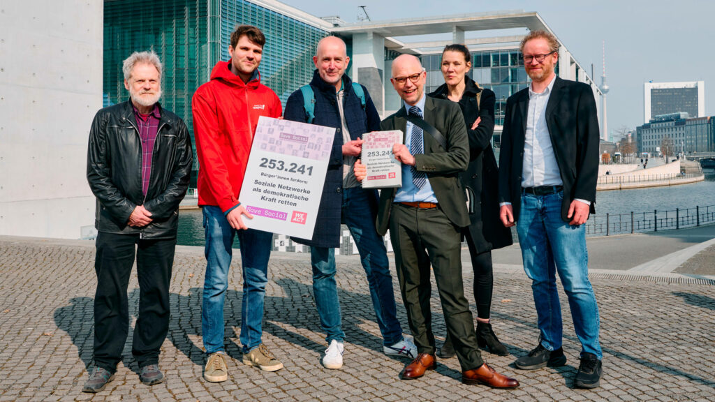 Rechtsextreme Propaganda verbreitet sich rasant auf Facebook, Instagram und X – und die Betreiber tun alles, damit das so bleibt. Über 250.000 Menschen möchten das ändern und haben die WeAct-Petition der Initiative Save Social unterzeichnet. Die Petent*innen schlagen zehn konkrete Schritte zur Rettung unserer Demokratie vor. Sie wollen Plattform-Monopole wie TikTok, Instagram und X öffnen und gemeinnützige und demokratische Alternativen stärken. Ende März trafen sie Politiker*innen von SPD, Grünen und Linken im Bundestag und übergaben ihnen ihre Petition.