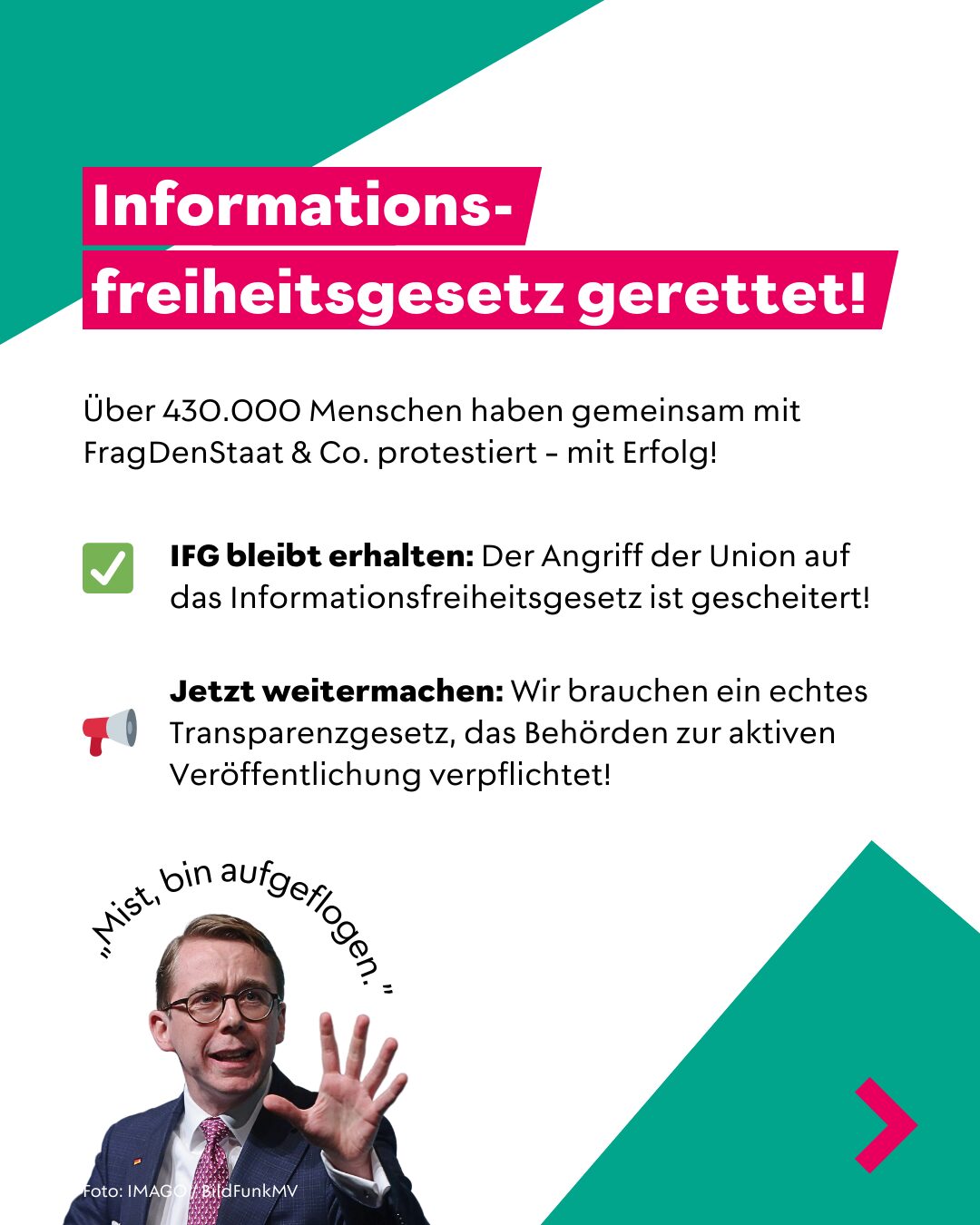 Fast 50 weitere NGOs wandten sich in einem offenen Brief an die SPD. Und auch das Medienecho war riesig. Das machte Eindruck auf die Verhandler*innen: Im Koalitionsvertrag von Union und SPD steht, dass das Informationsfreiheitsgesetz bleibt – und in seiner bisherigen Form mit einem Mehrwert für Bürger*innen und Verwaltung reformiert werden soll.