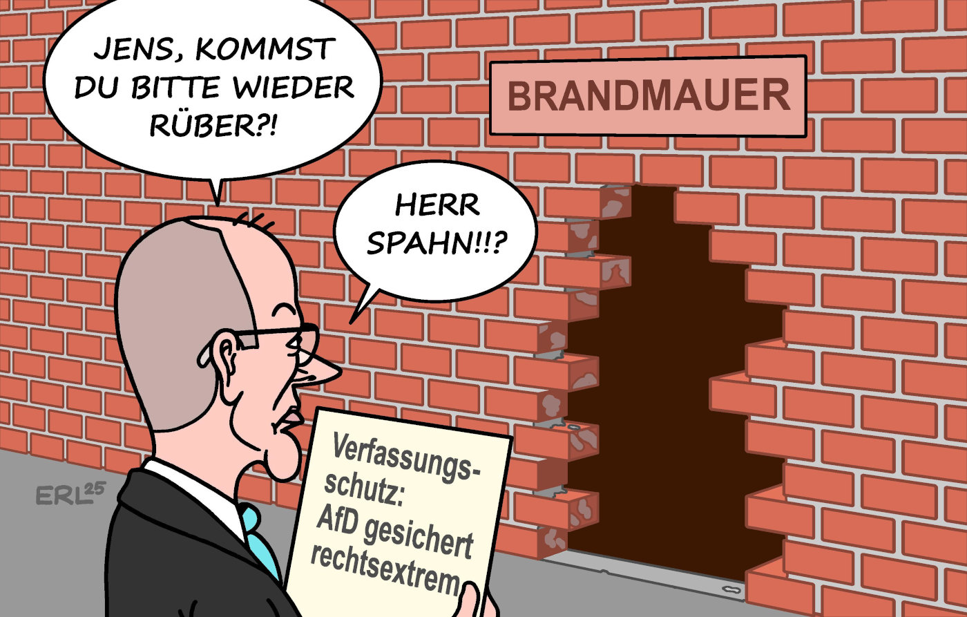 In der Karikatur von Martin Erl versucht Merz, Spahn wieder auf diese Seite der Brandmauer zurückzuholen. Das funktioniert zumindest zum Teil: „[…] zum Umgang mit der AfD in den parlamentarischen Abläufen werden sich Union und SPD selbstverständlich eng abstimmen und in allen Fragen gemeinsam vorgehen“, schrieb er am Sonntag auf X. „Eine Empfehlung, AfD-Abgeordnete zu Ausschussvorsitzenden zu wählen, wird es von unserer Seite nicht geben.“ Die künftige Koalition werde den Bericht des Verfassungsschutzes mit der Einstufung der AfD als gesichert rechtsextrem auswerten und über mögliche Konsequenzen beraten.