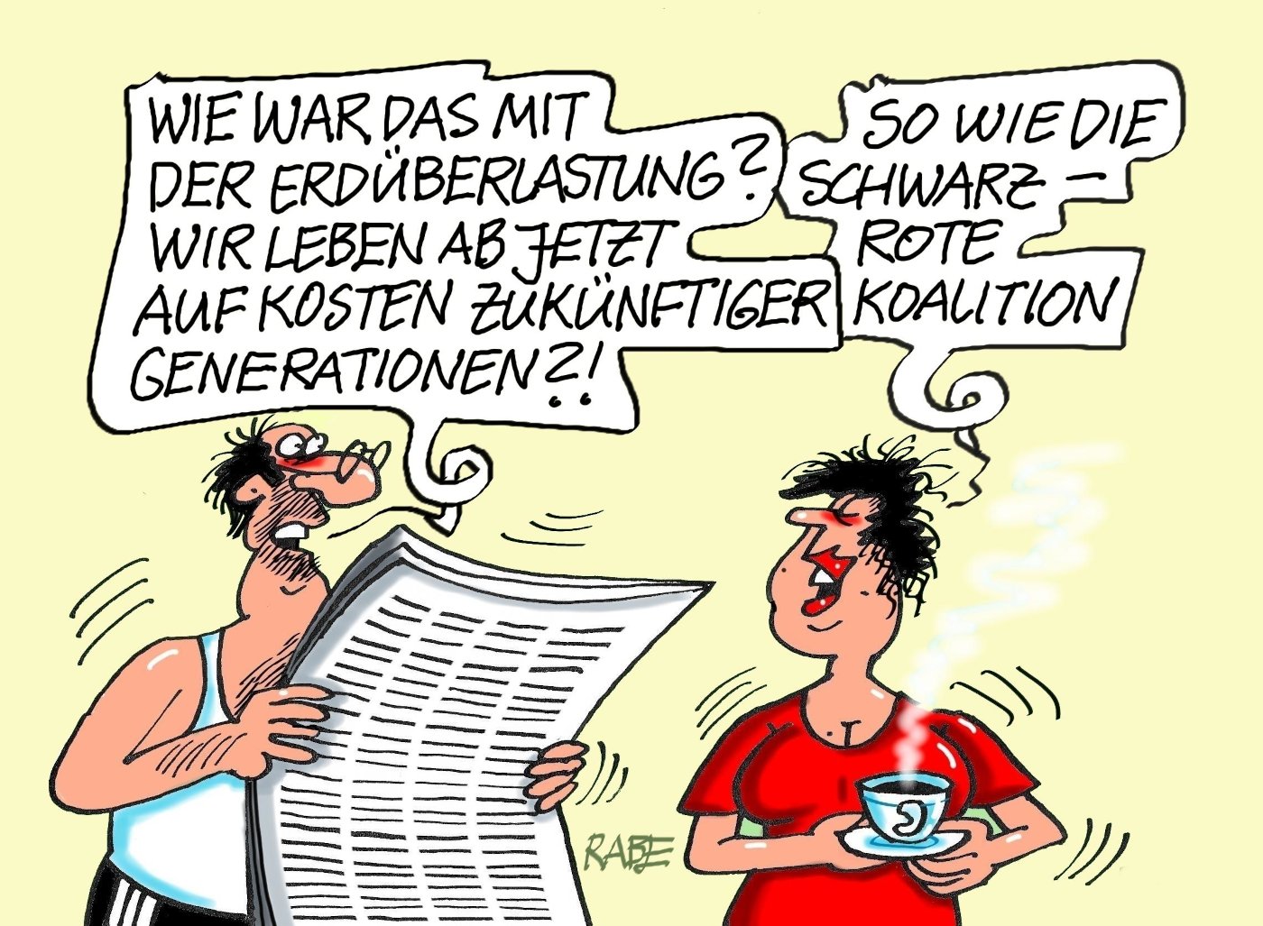 Auch darauf nimmt die Karikatur von RABE Bezug: Die Person rechts wirft ein, dass auch die schwarz-rote Koalition auf Kosten der zukünftigen Generationen lebt. Das ist auch nicht ganz abwegig, denn SPD-Bundesfinanzminister Lars Klingbeil und die schwarz-rote Koalition planen eine Rekordverschuldung. Viele Menschen sorgen sich deshalb um den Bundeshaushalt. Dabei gibt es erstmal keinen Grund zur Sorge, schreibt Campact-Blogautor Hannes Koch in seinem Beitrag vergangene Woche.