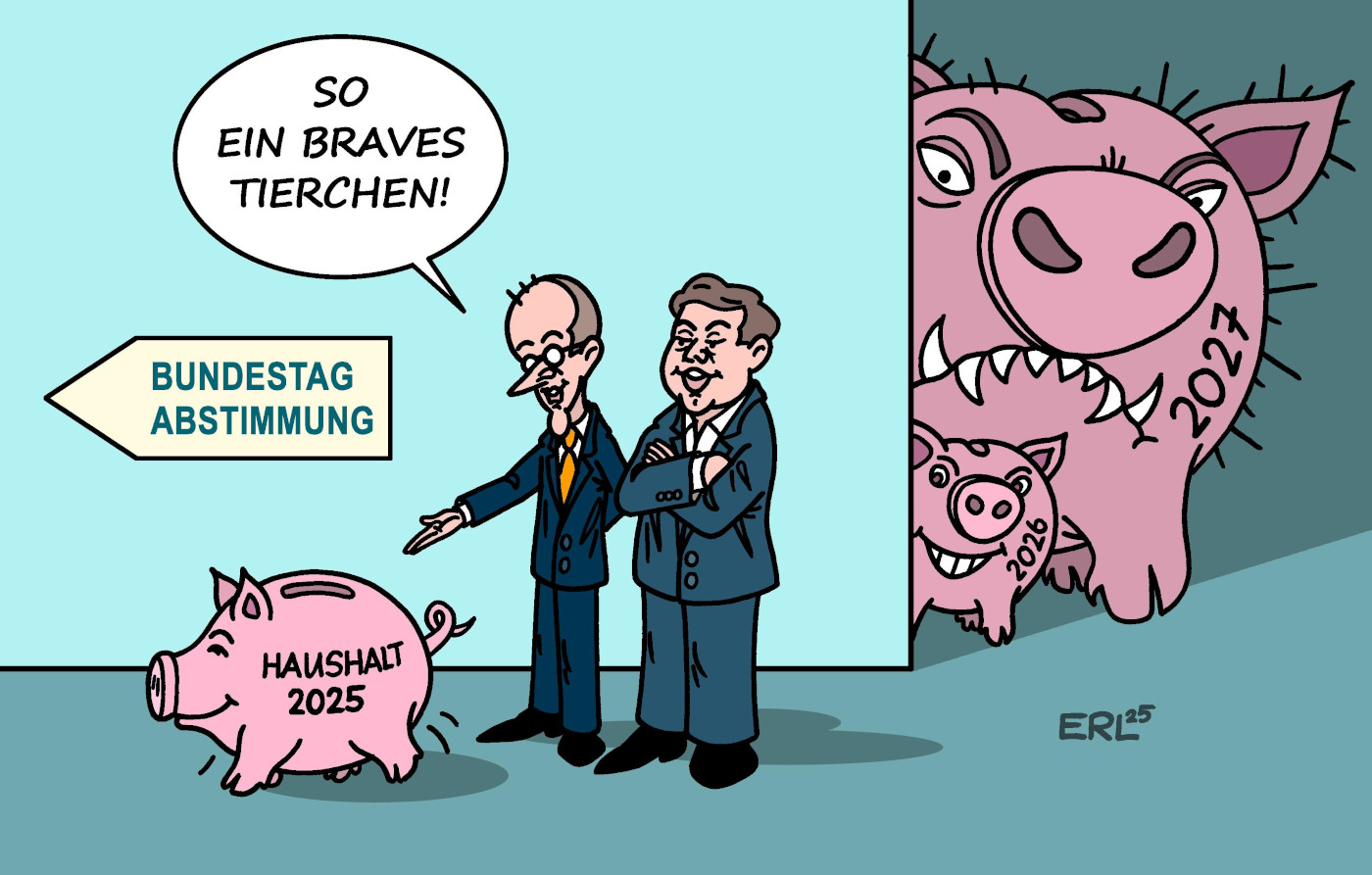 Nach wochenlangem Ringen steht er nun endlich: der Haushalt für den Bund für 2025. Bundesfinanzminister Lars Klingbeil (SPD) und Kanzler Friedrich Merz (CDU) haben mit ihren Parteien einen Entwurf erarbeitet, den sie selbst als „Gamechanger“ beschreiben. Der Bundestag soll in der nächsten Sitzungswoche (16. bis 19. September) endgültig über den Etat entscheiden. Die Zustimmung für den Haushalt ist im Grunde sicher. Deswegen freut sich der Friedrich Merz in der Karikatur von Karikaturist Erl auch so, dass das „Haushalts-Sparschwein“ so ein braves Tier sei – während die Haushaltspläne für 2026 und 2027 hinter einer Ecke lauern und bedeutend bedrohlicher aussehen.