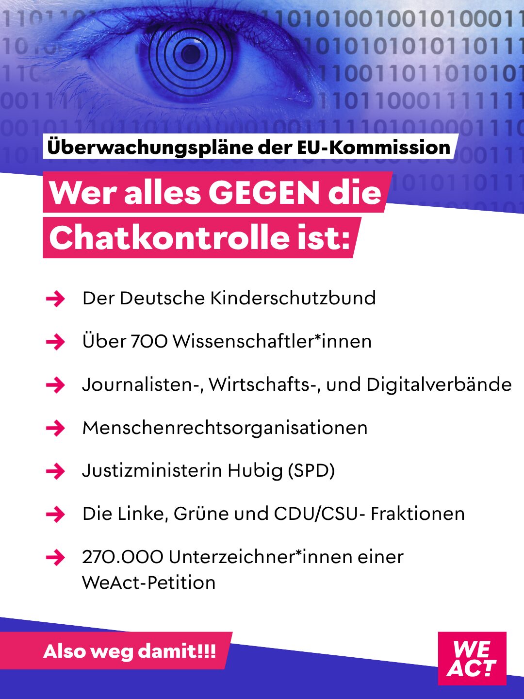 Kritiker*innen warnen: Der Vorschlag führt zu allgemeiner, anlassloser Massenüberwachung. Auch legale Inhalte könnten darunter fallen, Fehlalarme ließen sich kaum verhindern. Persönliche und vertrauliche Kommunikation geriete dadurch pauschal unter Verdacht. Die Entscheidung der EU für die Chatkontrolle hätte weitreichende Auswirkungen auf die digitale Kommunikation aller Bürger*innen.