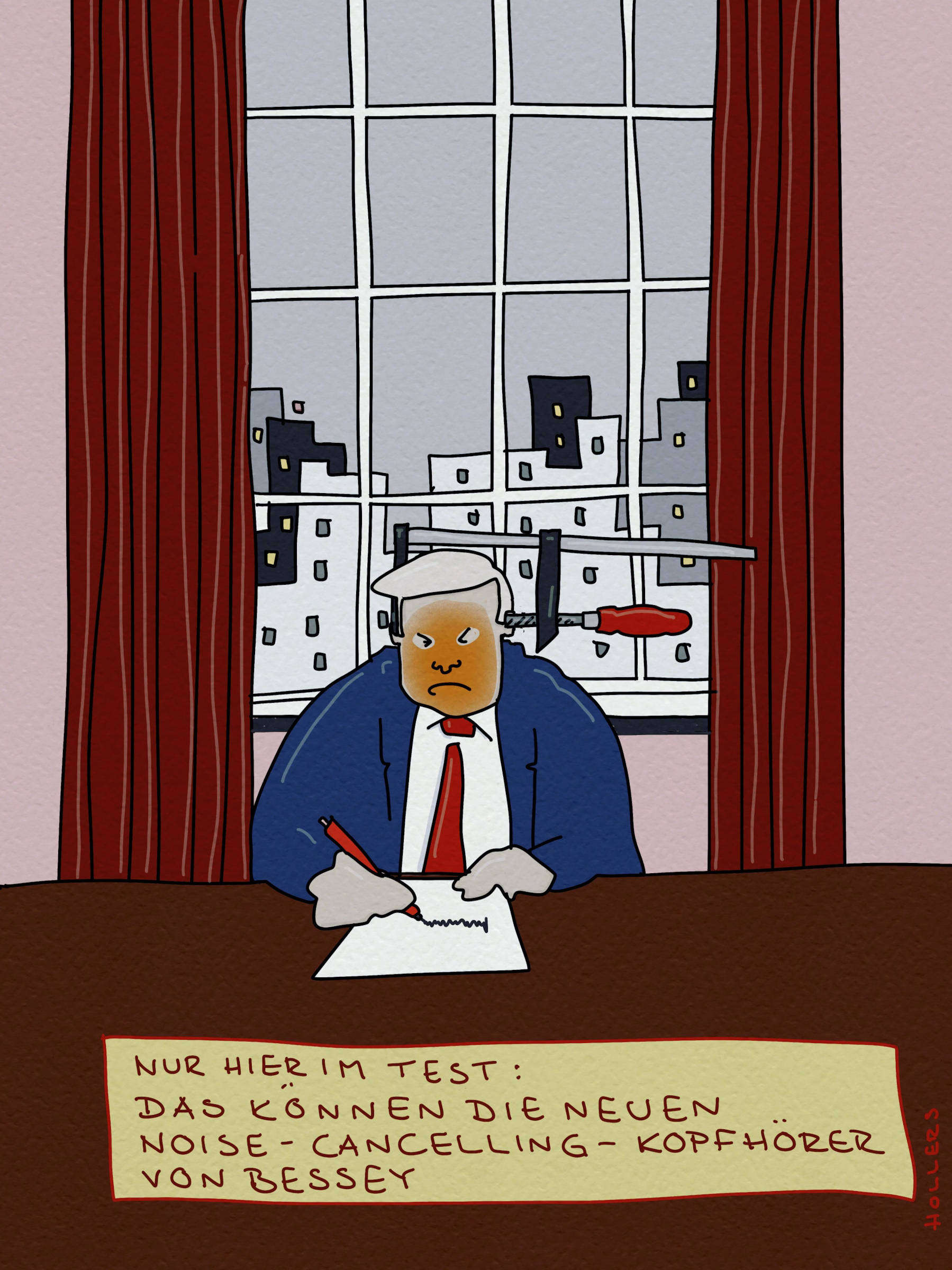 US-Präsident Donald Trump will gerade so einiges nicht hören. Kritik an seiner Politik hat er noch nie an sich herangelassen; darauf reagiert er mit Drohungen und einer Stimmung der Angst. Die neue Karikatur von Holger „Hollers“ Weyrauch zeigt, wie Trump vielleicht noch auf Lärm reagiert: mit einer ganz besonderen Art von Gehörschutz. Hat er sich die Zange, die er in der Zeichnung auf dem Kopf trägt, vielleicht von der nahen Baustelle geliehen?