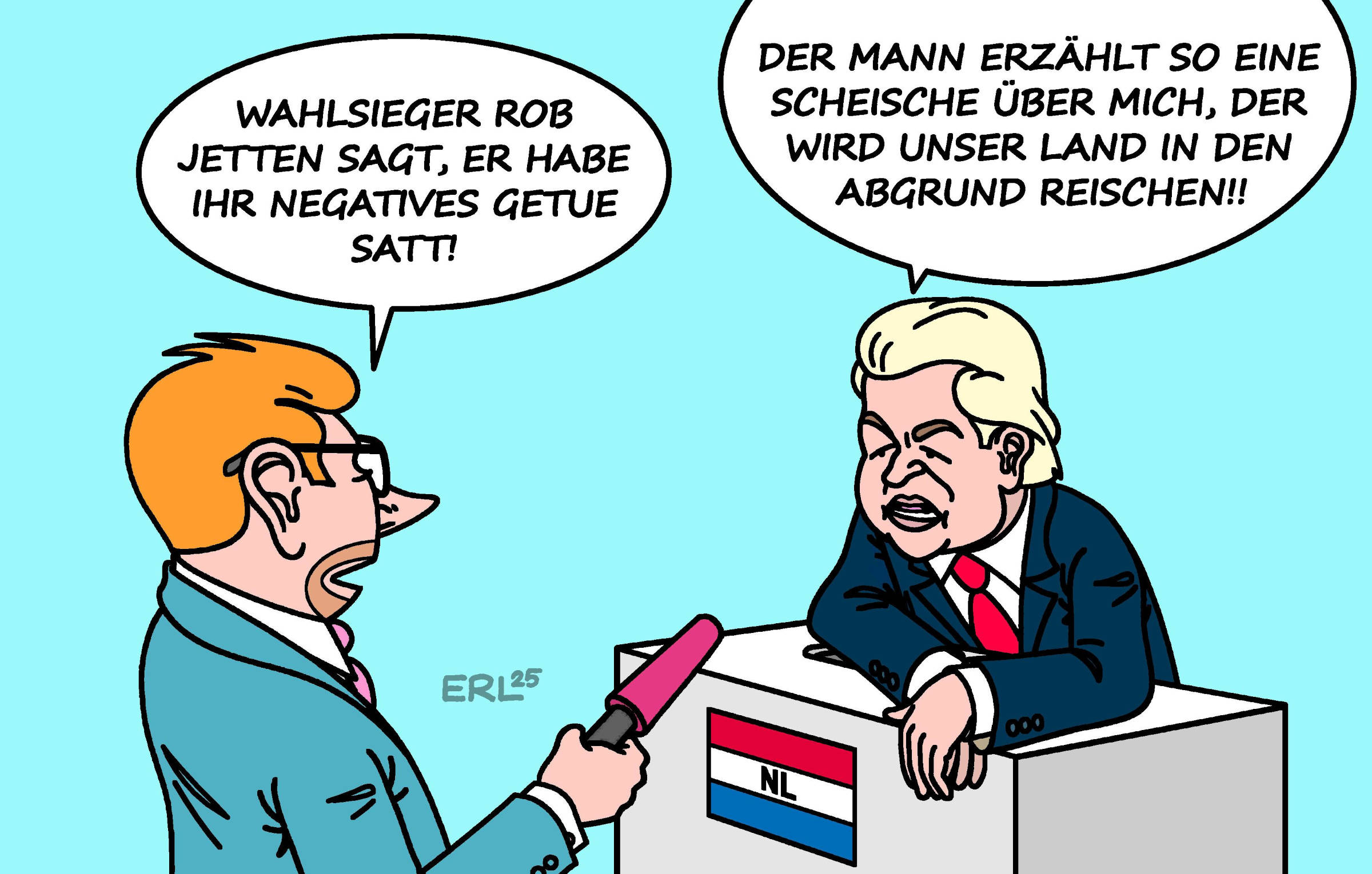 Traditionell darf die Partei mit den meisten Stimmen auch als erste versuchen, eine Koalition zu bilden. Beste Aussichten für das Amt des Regierungschefs hat deswegen der D66-Spitzenkandidat Rob Jetten. Wilders hat keine Option auf die Regierung, denn alle großen Parteien haben eine Zusammenarbeit mit seiner „Partei für die Freiheit“ (PVV) ausgeschlossen. Der Rechtspopulist reagierte bereits vor der offiziellen Verkündigung des Ergebnisses mit Verteidigung: Es habe Ungereimheiten bei der Auszählung gegeben. Begründen konnte er diese Anschuldigungen nicht. Weit hergeholt ist das Szenario, das Karikaturist Erl in seiner Karikatur darstellt, also nicht.