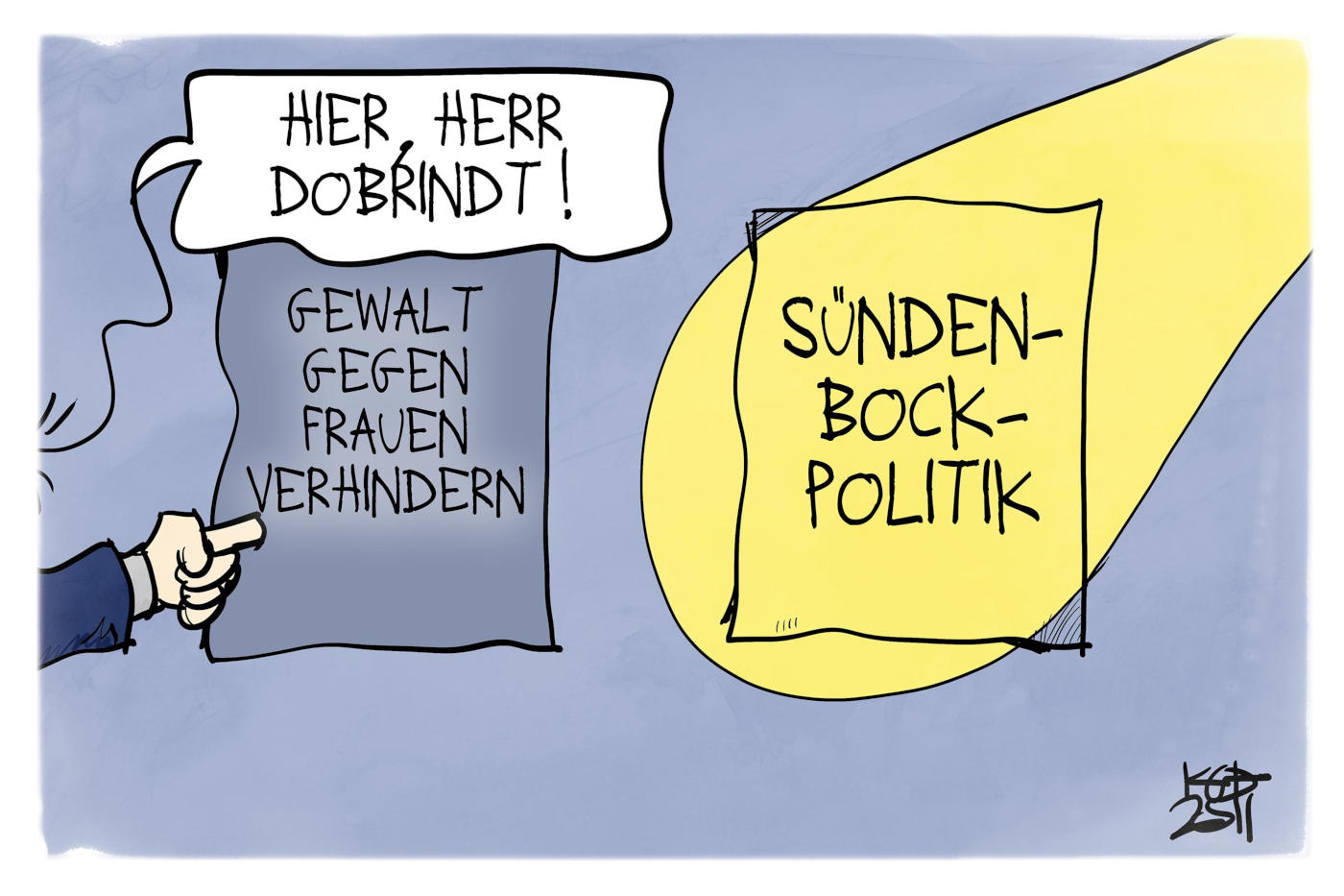 Was Dobrindt bei der Vorstellung des Berichtes aber auch unbedingt betonen wollte: Mehr als ein Drittel (37 Prozent) der Tatverdächtigen bei partnerschaftlicher Gewalt seien Nicht-Deutsche. „Nicht-Deutsche Tatverdächtige sind damit deutlich überrepräsentiert“, sagte Dobrindt bei der Pressekonferenz. Aber auch bei den Opfern sei rund ein Drittel nicht deutsch und damit „deutlich überrepräsentiert“. Inwiefern ein Drittel eine Überrepräsentation darstellt, fragt sich auch Karikaturist Kostas Koufogiorgos. Er bringt zu Papier, was viele denken: Herr Dobrindt, hier geht’s um Gewalt gegen Frauen, nicht um Herkunft!