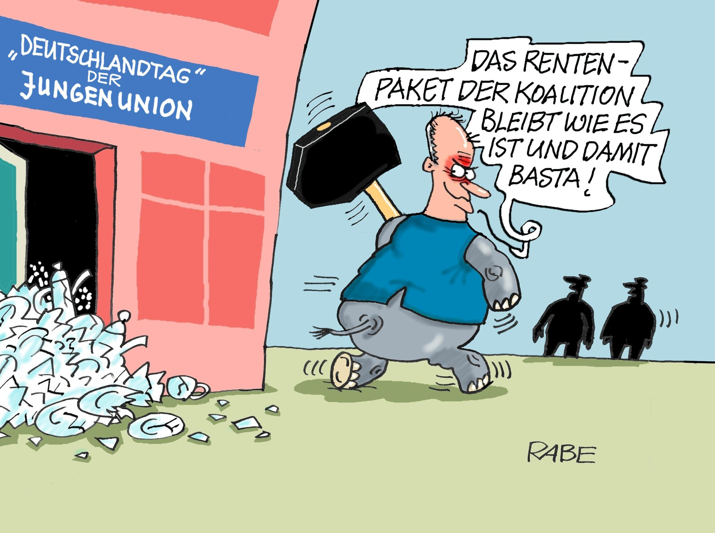 Wie ein Elefant im Porzellanladen: So beschreibt Karikaturist RABE das Auftreten von Kanzler Friedrich Merz (CDU) auf dem „Deutschlandtag“ der Jungen Union (JU). Die Jugendvereinigung von CDU und CSU hatte „ihren“ Kanzler selbstverständlich eingeladen. Merz kam – und brachte eine hitzige Debatte mit. Das neue Rentenpaket der Union spaltet die Partei. Auch die Junge Union äußerte Kritik. Merz wählte daraufhin die Holzhammer-Methode und teilte sowohl auf dem Deutschlandtag als auch im Nachgang in einem Fernsehinterview gegen seine Kritiker aus.