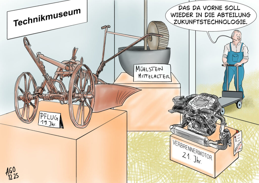 Die EU-Staaten und das Europaparlament hatten 2022 beschlossen, dass Neuwagen in der EU ab 2035 kein klimaschädliches Kohlenstoffdioxid (CO₂) mehr ausstoßen dürfen. Diese Schutzmaßnahme für Klima und Menschen war auch ein Schubs in Richtung einer Zukunft mit innovativen Antrieben. Nach dem Druck der Autobranche und auch der Bundesregierung zeichnet sich aber ab, dass dieses Vorgabe, von Kritikern oft als Verbrenner-Aus betitelt, aufgeweicht wird. Mit dem Auto gehts zurück ins 20. Jahrhundert – und der Verbrennermotor wird wieder eine Zukunftstechnologie, wie es auch Karikaturist Ago in seiner Karikatur zeigt.