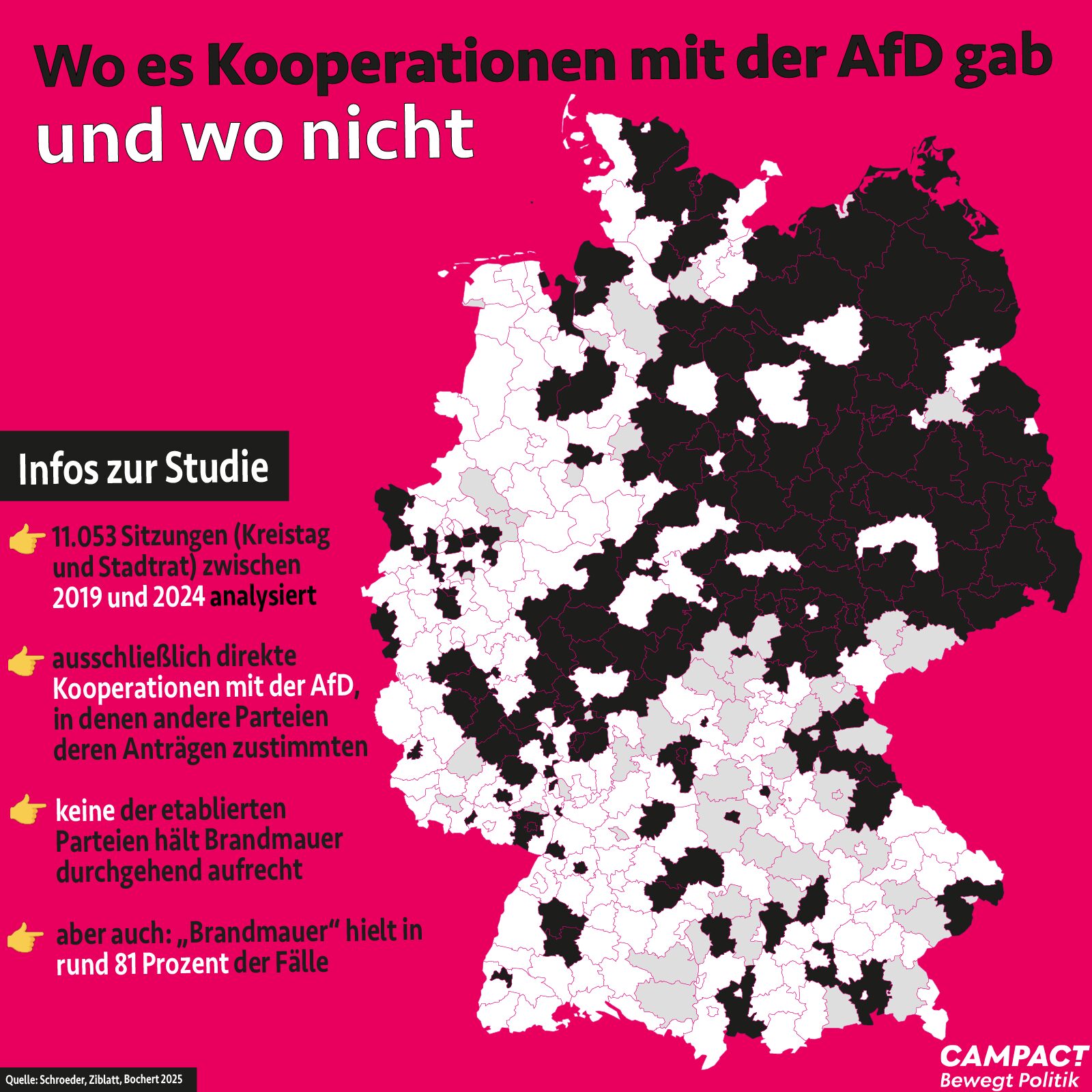 Das Bild der Brandmauer als Symbol für politischen Abstand sollte also nicht darüber hinwegtäuschen, dass die extreme Rechte viele Methoden kennt, um subtil und langfristig Einfluss zu nehmen – mithilfe aller anderen. Und selbst dort, wo es „Brandmauer“ tönt, lohnt es sich, genauer hinzusehen. Eine Studie aus dem März 2025 belegt, wie häufig Parteien auf Kreisebene und in kreisfreien Städten mit der AfD kooperieren. Für Mecklenburg-Vorpommern lassen sich den Forschenden zufolge mehr als 100 Fälle zwischen 2019 und 2024 finden, in denen Parteien einem AfD-Antrag zustimmten. Oft werden solche Entscheidungen mit pragmatischen Argumenten begründet – beispielsweise, dass die unmittelbaren Interessen der Menschen vor Ort wichtiger seien als ideologische, verabredete Grenzen. Solange das eben noch geht.
