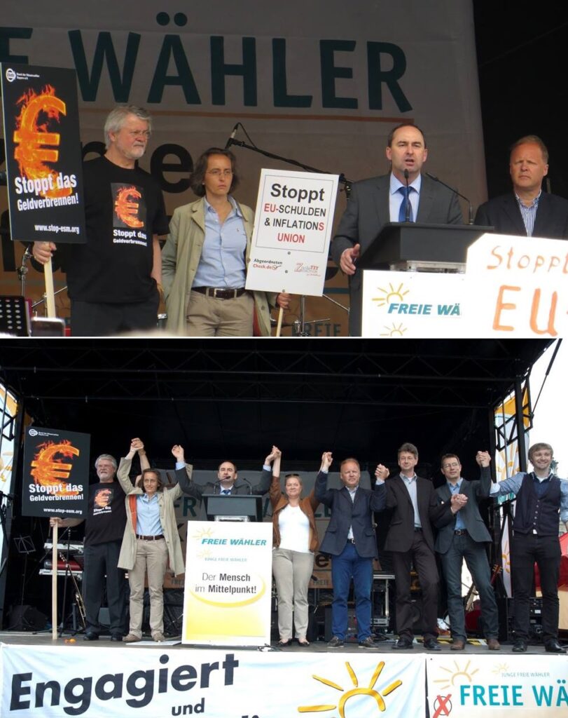 Fünf Tage nachdem Hans-Olaf Henkel im September 2012 alarmierend im Handelsblatt den Artikel „EZB: Aus, aus, das Spiel ist aus!“ veröffentlichte, erhielten die FW weitere Unterstützung: Auf Facebook kündigte sich der Verein „WA2013“, die „Wahlalternative 2013“, gegründet im September 2012 von Gerd Robanus, Bernd Lucke, Konrad Adam und Alexander Gauland. Im November 2012 stellte Lucke die WA2013 in München vor. Danach gründeten sie mit dem Geld des Familienunternehmers August Baron von Finck dann doch eine eigene Partei, statt mit den Freien Wählern zusammen zu gehen.