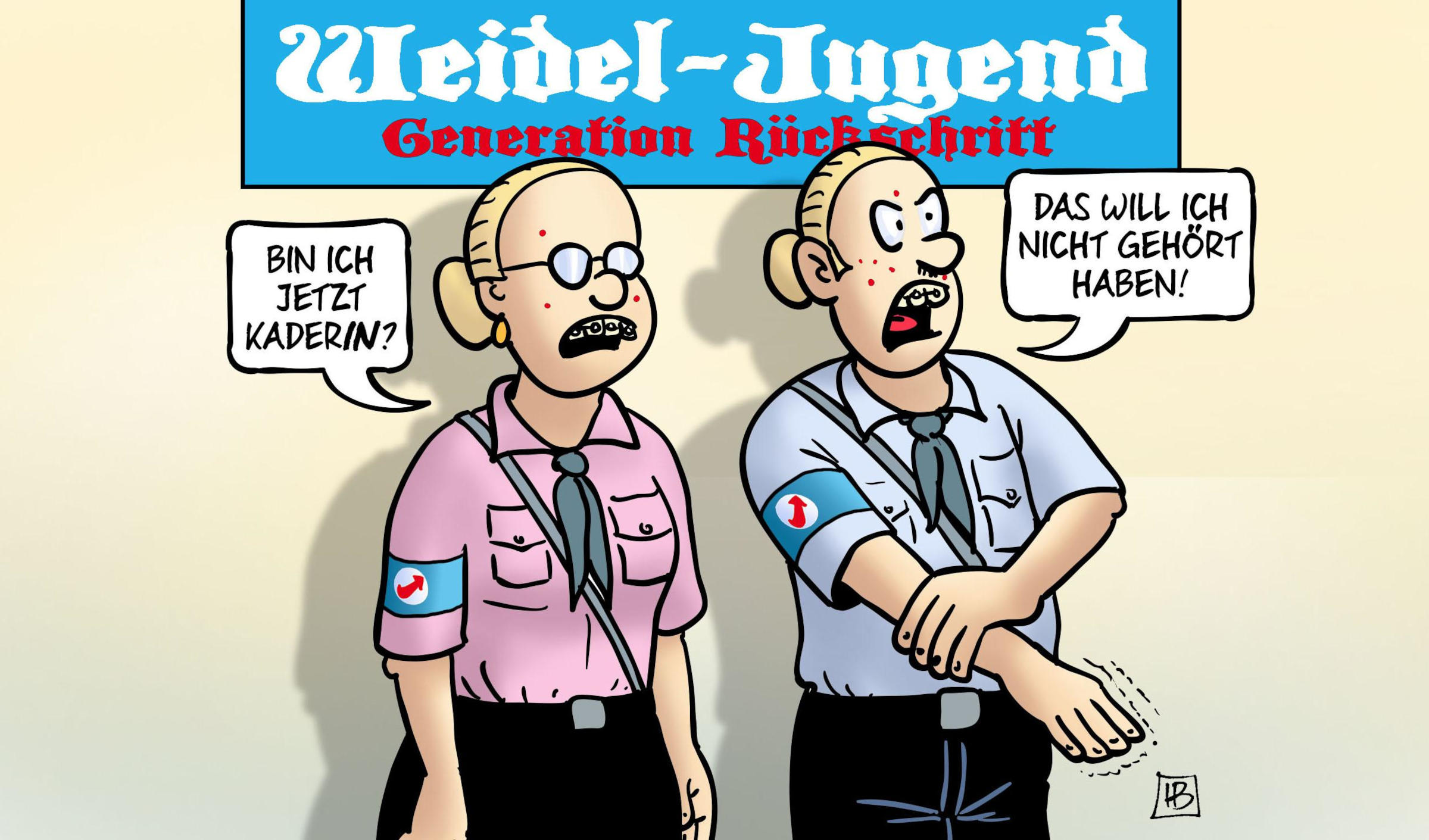 AfD-Co-Chefin Alice Weidel betonte, die Parteijugend müsse sich als „Kaderschmiede“ für die Partei verstehen. „Ihr seid die nächste Generation nach mir, nach Tino Chrupalla, nach den Alten hier, die unser Land führen.“ Das Wort „Kader“ dabei aber bitte nicht gendern – das könnte Karikaturist Harm Bengen nach Ärger geben. In seiner Karikatur heißt die Weidel-Jugend „Generation Rückschritt“ und erinnert sehr stark an eine Jugendorganisation aus den 1930er-Jahren.