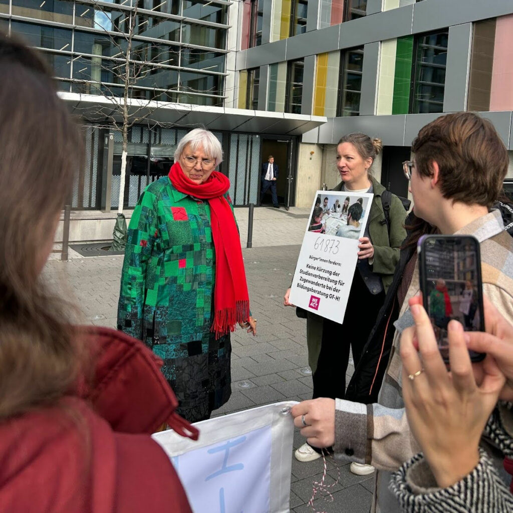 Außerdem hat sich erneut gezeigt: Während einer Sitzungswoche als große Gruppe mit Schildern vor dem Bundestag stehen kann sich lohnen. Viele Abgeordnete sind dann im Regierungsviertel unterwegs – und werden auf Proteste aufmerksam. So auch diesmal. Claudia Roth (Grüne) kam zufällig an Dorotheas Gruppe vorbei, zeigte großes Interesse und wünschte viel Erfolg. Wieder eine Abgeordnete mehr, die um die Bedeutung des Garantiefonds Hochschule weiß!