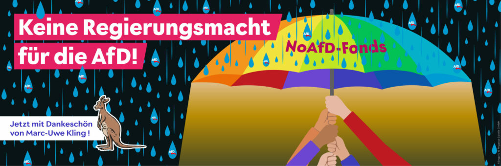 Genau an dieser Stelle haken wir ein. Mit dem NoAfD-Fonds wollen wir in den Landtagswahlen jeden Euro der Rechtsextremen kontern. Einerseits um Initiativen und Vereine vor Ort zu unterstützen, andererseits um eigene Kampagnen gegen die AfD zu fahren. Dafür brauchen wir Deine Unterstützung – spende jetzt!