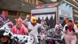 Auf einem großen Protestwagen ziehen drei riesige Tierfiguren durch Berlin zu Rainers Ministerium – jede über drei Meter hoch: eine empörte Kuh, ein wütendes Schwein, ein aufgebrachtes Huhn. Alle strecken Schilder in die Höhe: „Bessere Haltung!“ – „Mehr Platz!“ – „Faire Preise!“