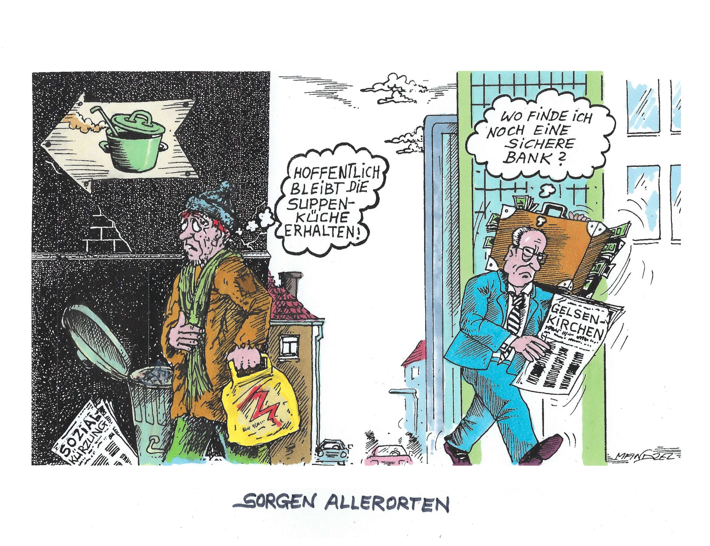 Die ganze Welt redet über Trump, seine Grönland-Pläne und die brutalen Methoden seiner Anti-Immigrations-Einheit ICE in den amerikanischen Städten. Aber auch hier in Deutschland gibt es Themen, denen wir Beachtung schenken sollten. Karikaturist Mandzel spricht zwei davon in seiner neuen Karikatur an. Einerseits die massiven geplanten Kürzungen in sozialen Bereichen und andererseits, dass manche Personengruppen davon gar nichts mitbekommen, weil sie nie betroffen sein werden. Während ein Mann um seine Existenz fürchtet, weil die lokale Suppenküche eventuell bald schließt, bangt ein zweiter um seine gehäuften Reichtümer, weil in Gelsenkirchen Bankräuber einen Tresor mit Schließfächern geknackt und leergeräumt haben.