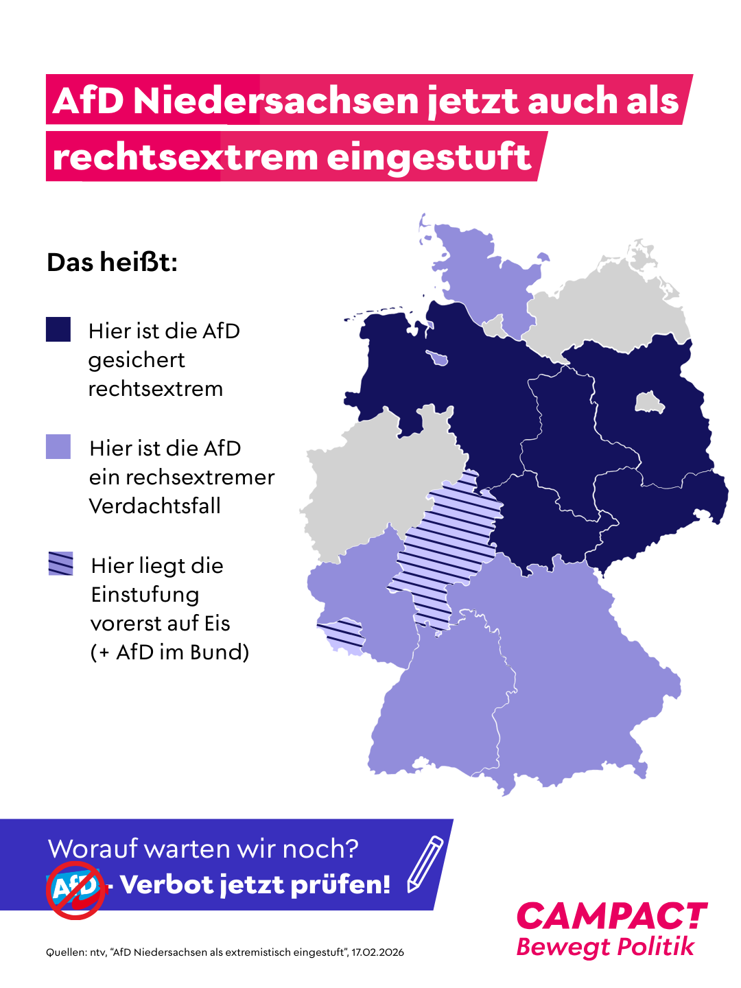 Mehrere Landesverbände der AfD gelten laut Landesverfassungsschutz bereits seit Längerem als „gesichert rechtsextreme Bestrebungen“ – darunter Sachsen, Sachsen-Anhalt und Thüringen. Im Sommer 2025 stufte der Verfassungsschutz auch die AfD Brandenburg als „gesichert rechtsextrem“ ein und im Februar 2026 folgte die AfD Niedersachsen.