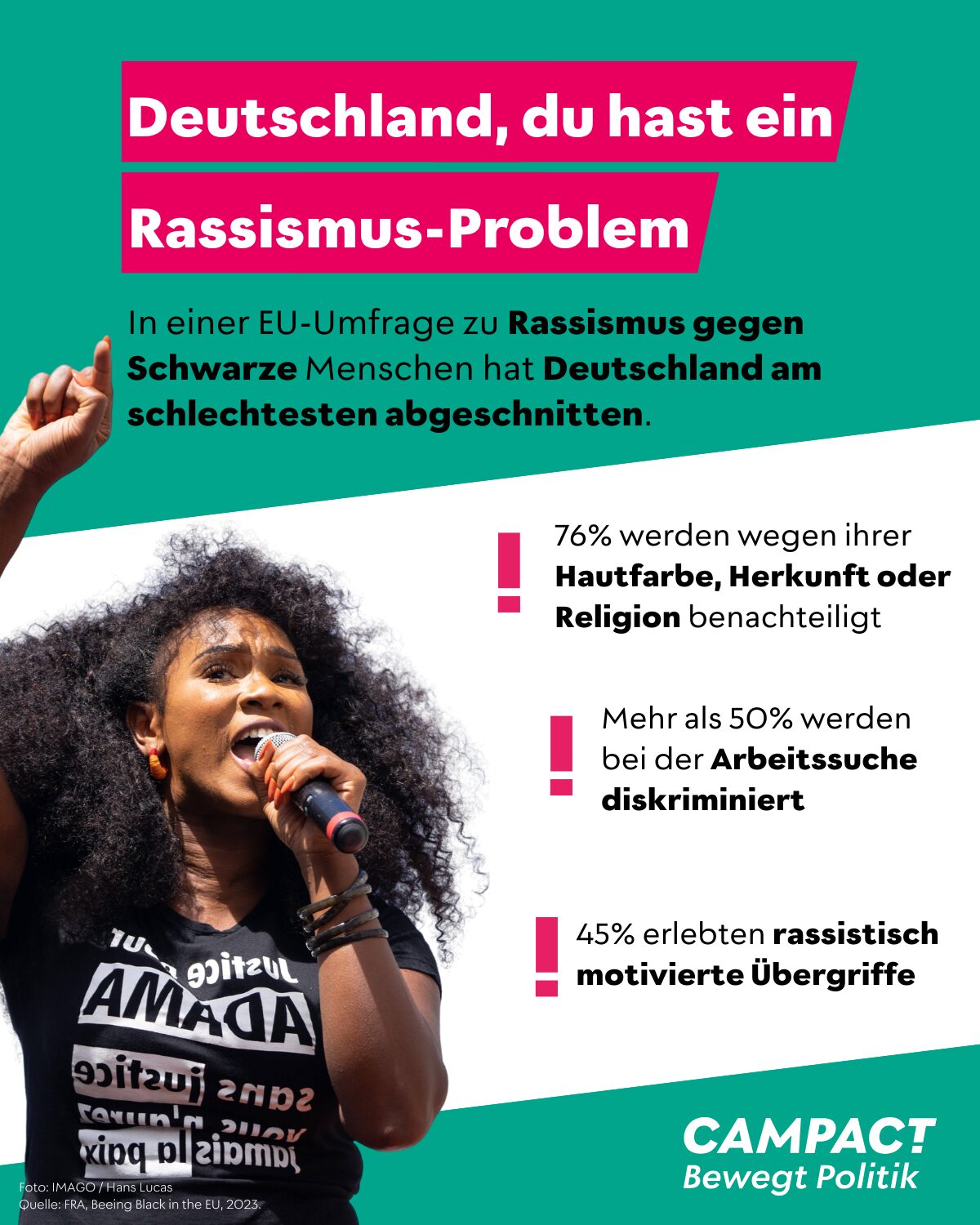 Studien wie „Rassistische Realitäten“ vom Nationalen Diskriminierungs- und Rassismusmontior oder Erhebungen der Europäischen Agentur für Grundrechte belegen das Problem. 77 Prozent der Befragten mit afrikanischem Migrationshintergrund berichten, in den vergangenen fünf Jahren Diskriminierung erlebt zu haben. Europaweit schneidet Deutschland damit am schlechtesten ab.