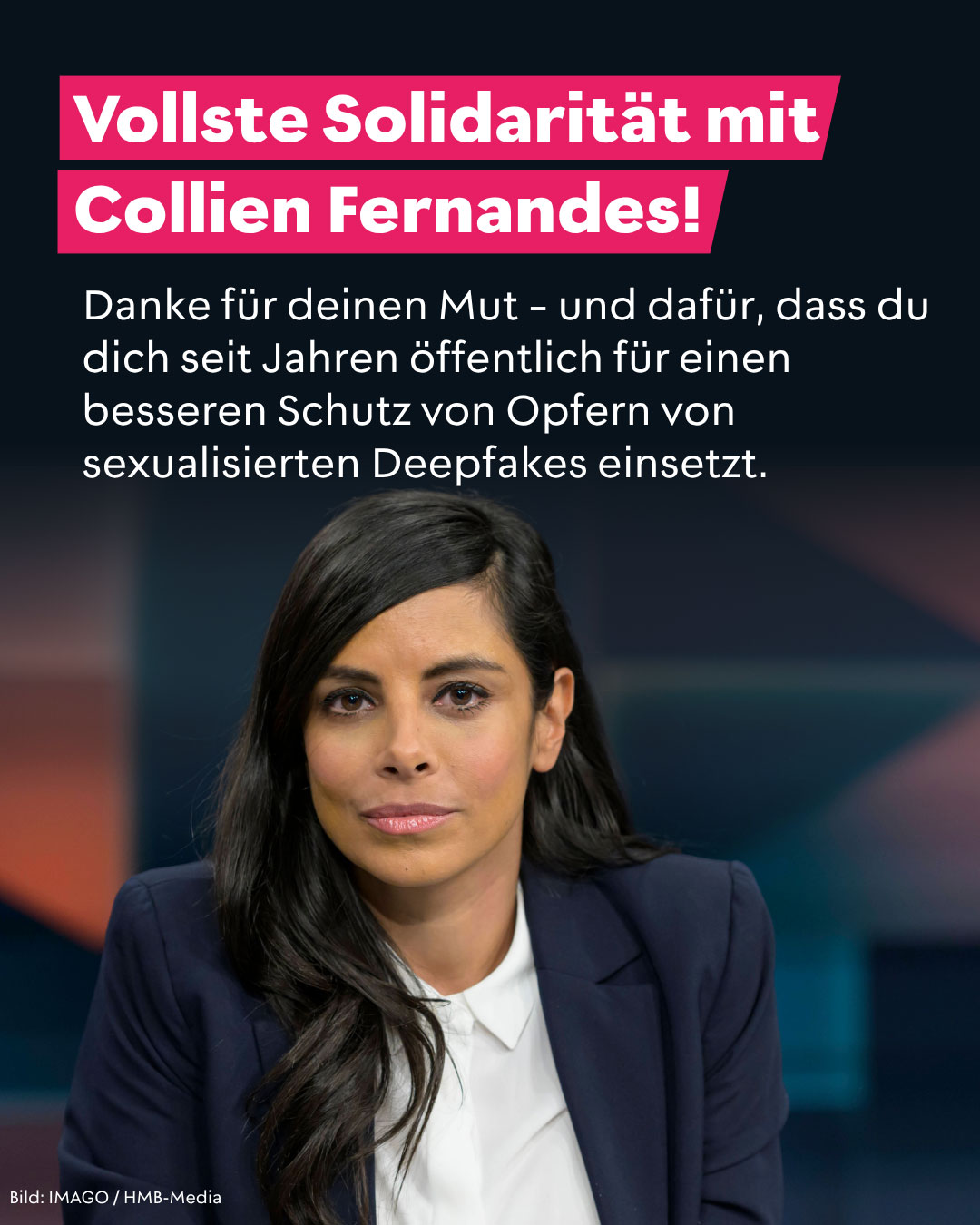 Über Jahre hinweg litt Collien Fernandes unter den gefälschten Accounts auf LinkedIn, Parship und Co. – und unter Deep Fakes mit ihrem Gesicht auf Pornoseiten. Mithilfe von Anwälten und Löschaufforderungen versuchte sie vergeblich, das Material aus dem Netz zu entfernen. Gemeinsam mit Hate Aid setzt sie seit Jahren öffentlich für einen besseren Schutz von Opfern von sexualisierter Deepfakes ein.