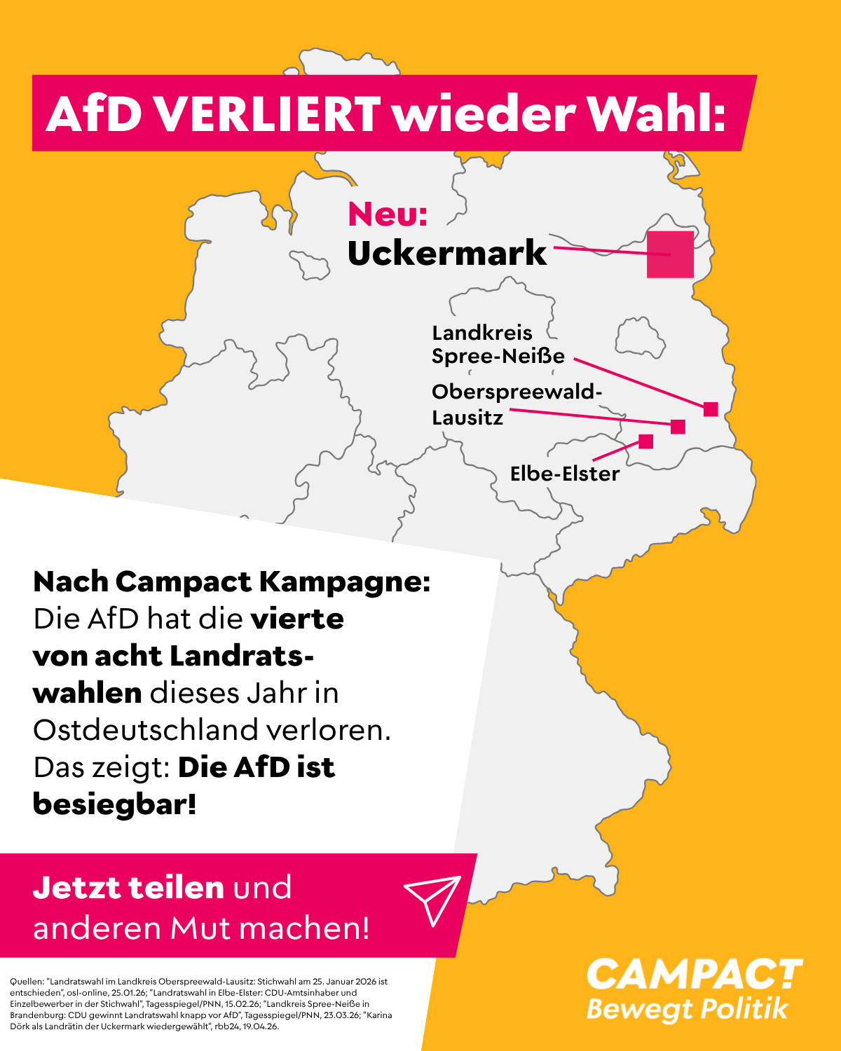 Der zweite rechtsextreme Landrat in Deutschland – das war das Ziel der AfD bei der Wahl am 19. April in der Uckermark (Brandenburg). Der bisher einzige und erste AfD-Landrat in Sonneberg (Thüringen) sollte kein Einzelfall bleiben. Doch Felix Teichner von der AfD scheiterte krachend: Er kam auf 40 Prozent, während die amtierende CDU-Landrätin Karina Dörk mit 60 Prozent gewann.