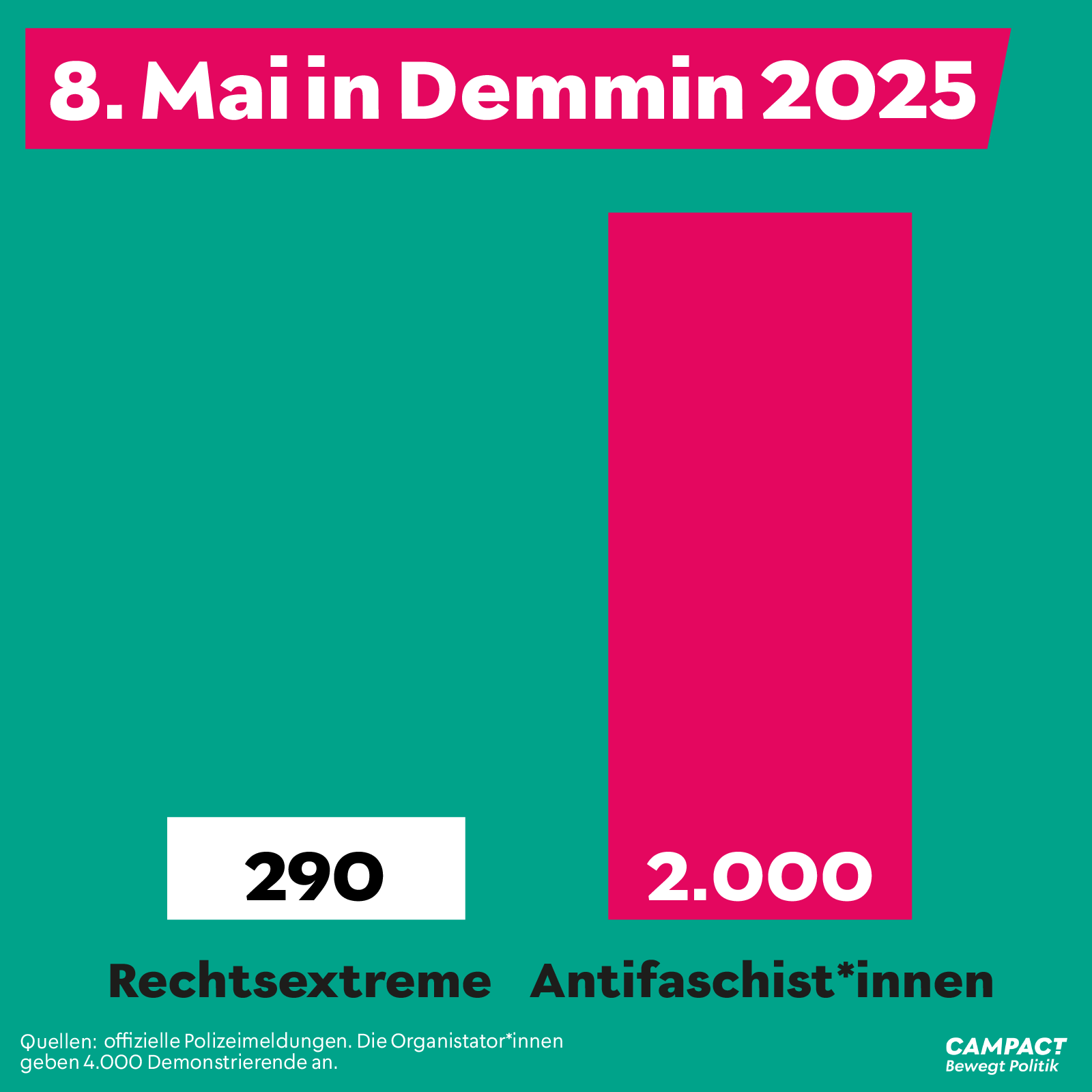 Genau diesen Trick der Opferinszenierung verwenden moderne Rechtsextreme. Seit 2007 – also seit knapp zwei Jahrzehnten – organisiert die Partei „Die Heimat“ (früher: NPD) am 8. Mai ihren sogenannten „Trauermarsch“ in Demmin. Im vergangenen Jahr waren etwa 290 Rechtsextreme anwesend. Das Ziel ist, medienwirksam einen Kranz ins Wasser zu werfen. Das deutsche Volk ist in dieser Erzählung Opfer der Umstände – ein kollektives Wir, das unverschuldet leidet. Die vorgegebene Emotion ist für jeden Menschen anschlussfähig: Trauer.