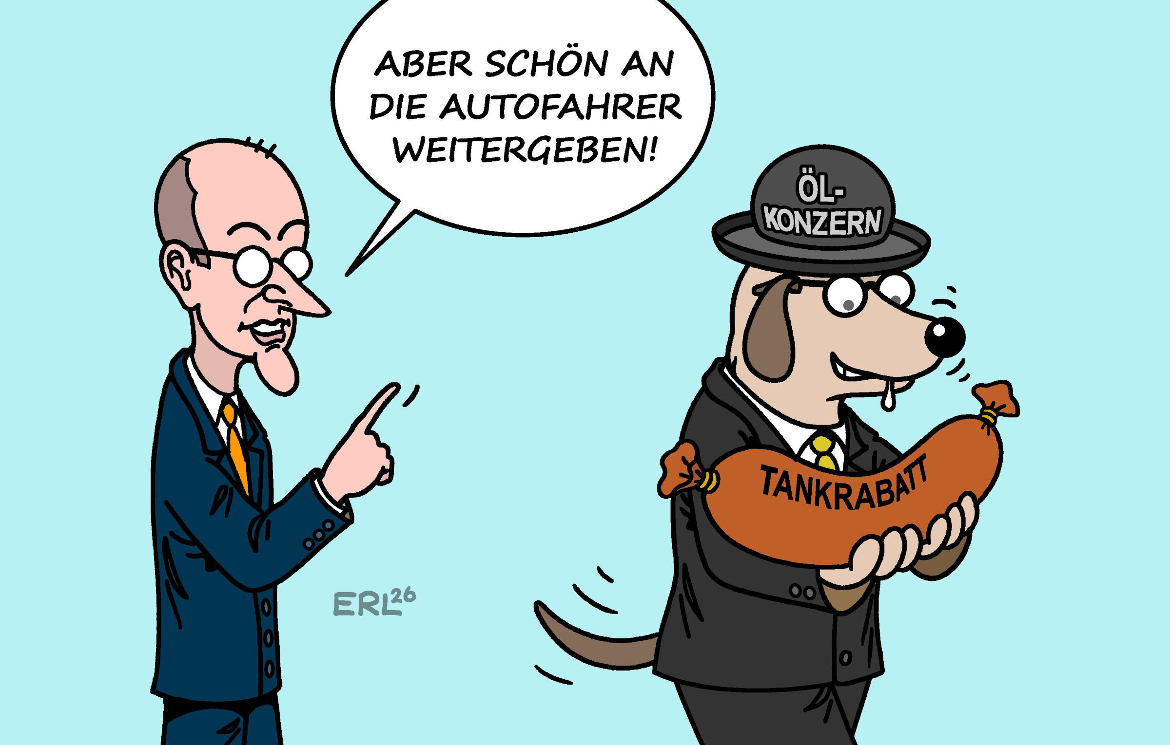 Und sie gehen wirklich verloren. Viele Kritiker*innen der Maßnahme befürchten, dass die Steuersenkung nicht bei den Verbraucher*innen ankommen wird – schließlich muss diese Vergünstigung erst mal an den Mineralölkonzernen vorbei. Die Bundesregierung vertraut darauf, dass die Konzerne den Rabatt weitergeben. Ein unglaubwürdiges Szenario, findet auch Karikaturist Erl. Seine neue Karikatur bringt das Dilemma auf den Punkt.