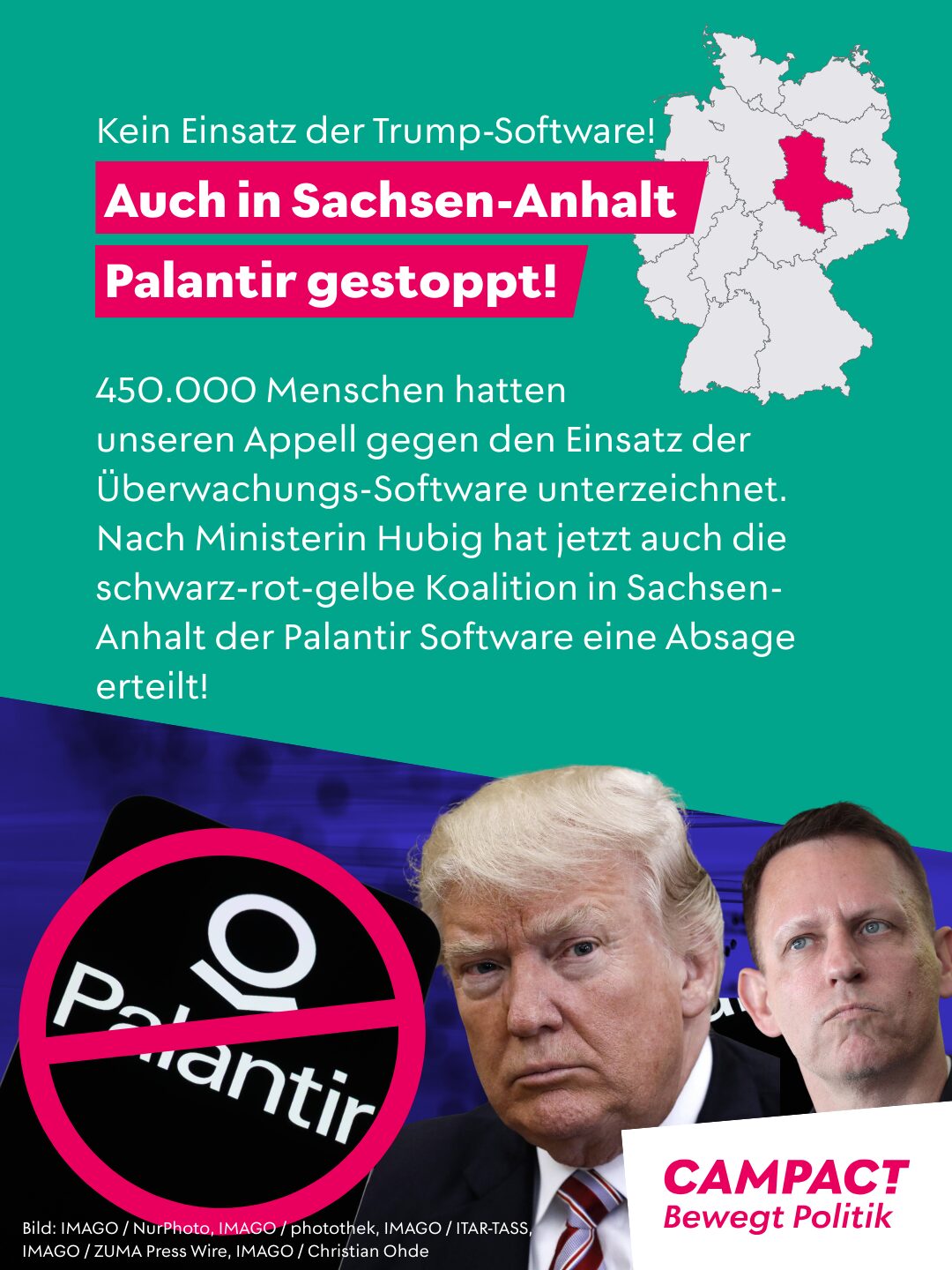 Während die unionsgeführten Länder nun auf eine bundesweite Einführung drängen, positionieren sich die SPD-Innenminister*innen der Länder gegen den Einsatz. Doch in Sachsen-Anhalt ist die SPD bereits ausgeschert und unterstützt den Einsatz der Thiel-Software.